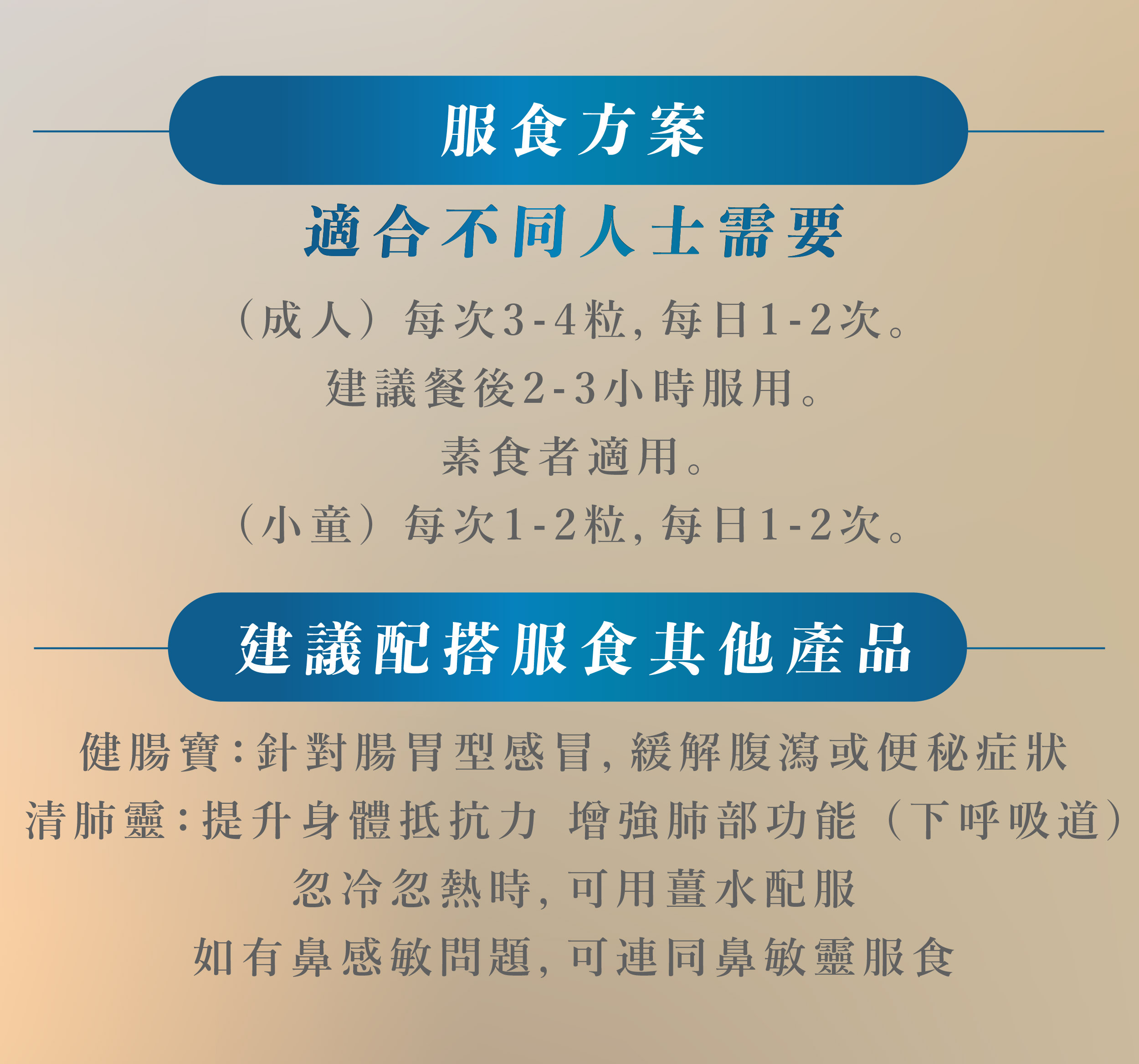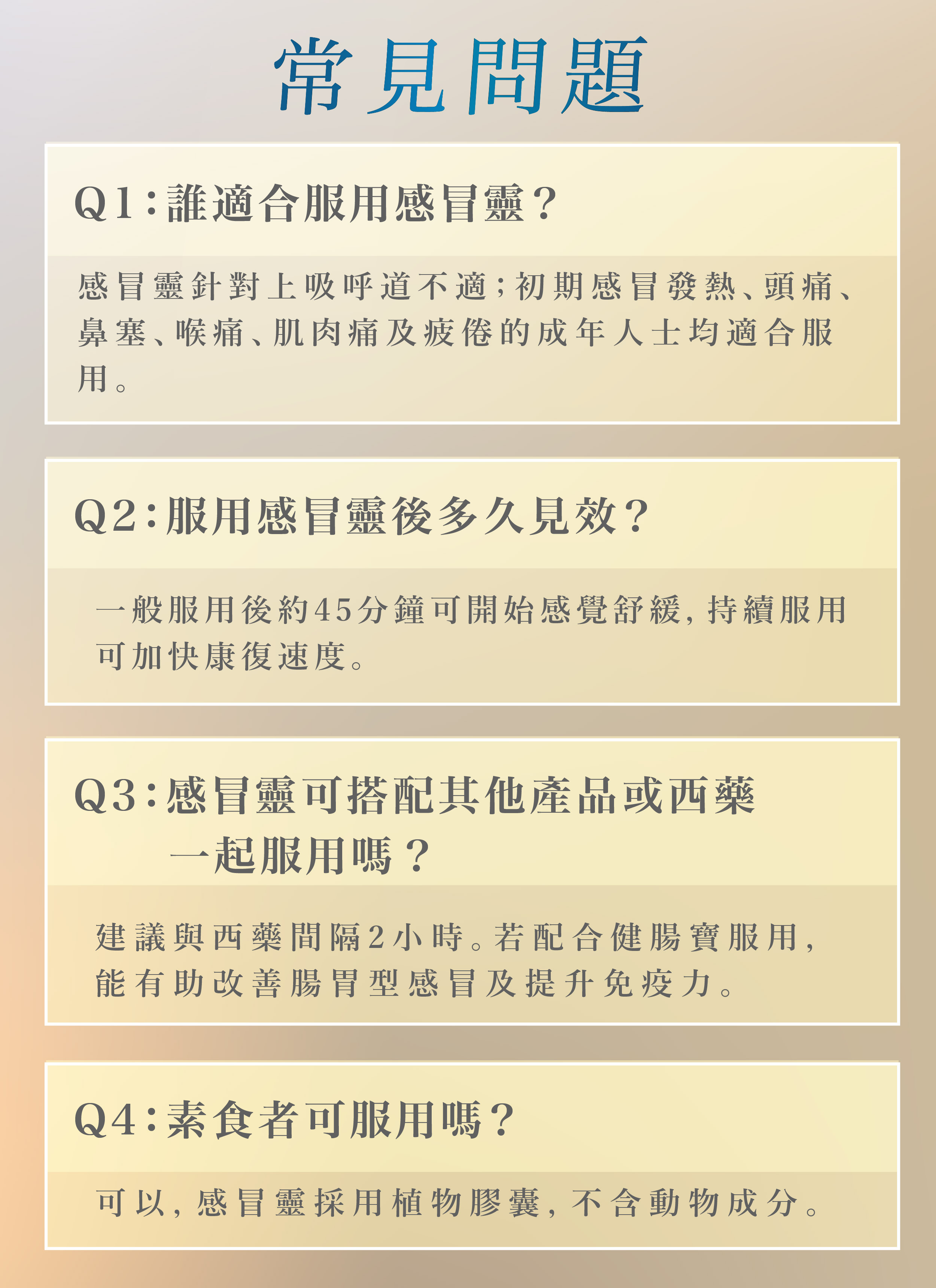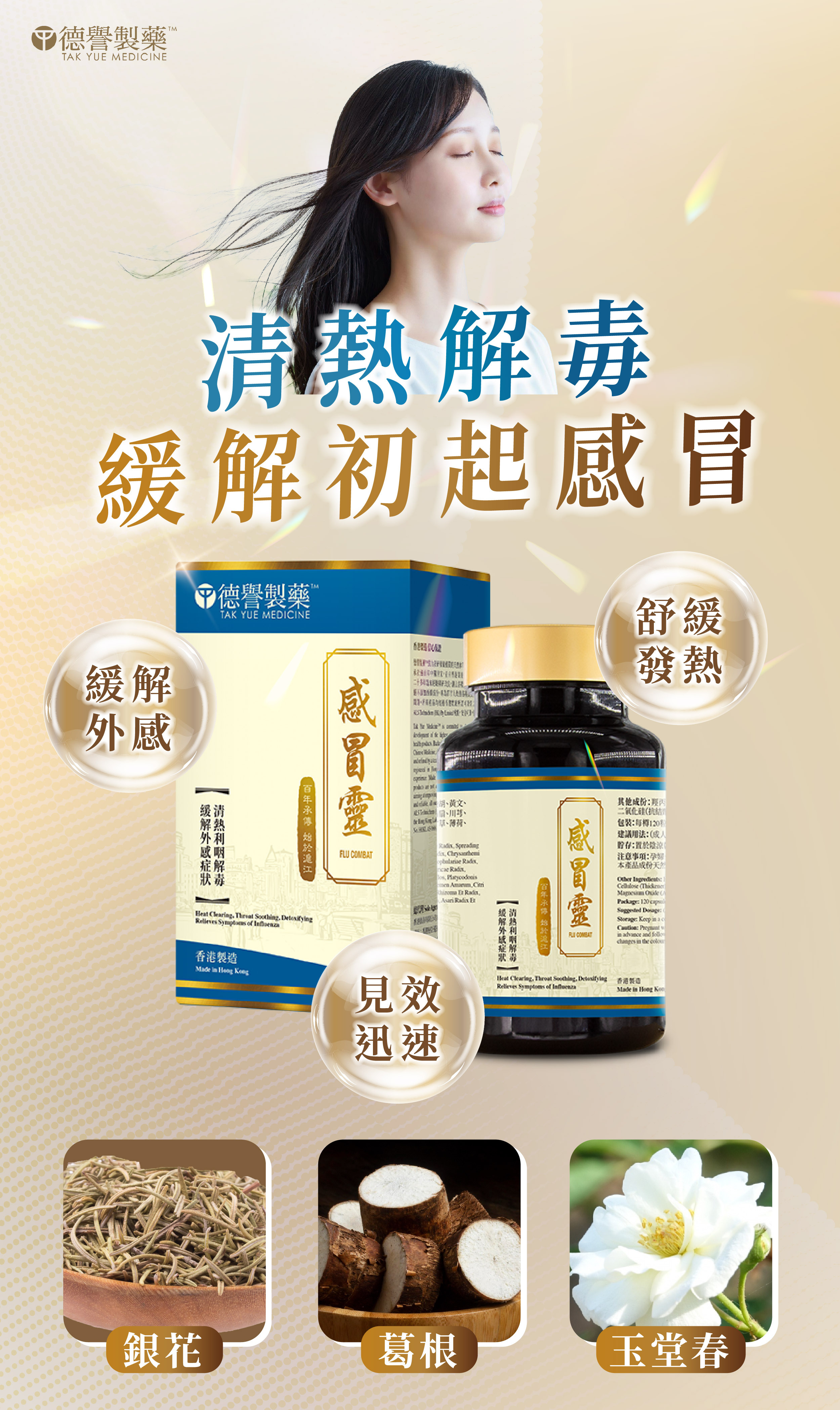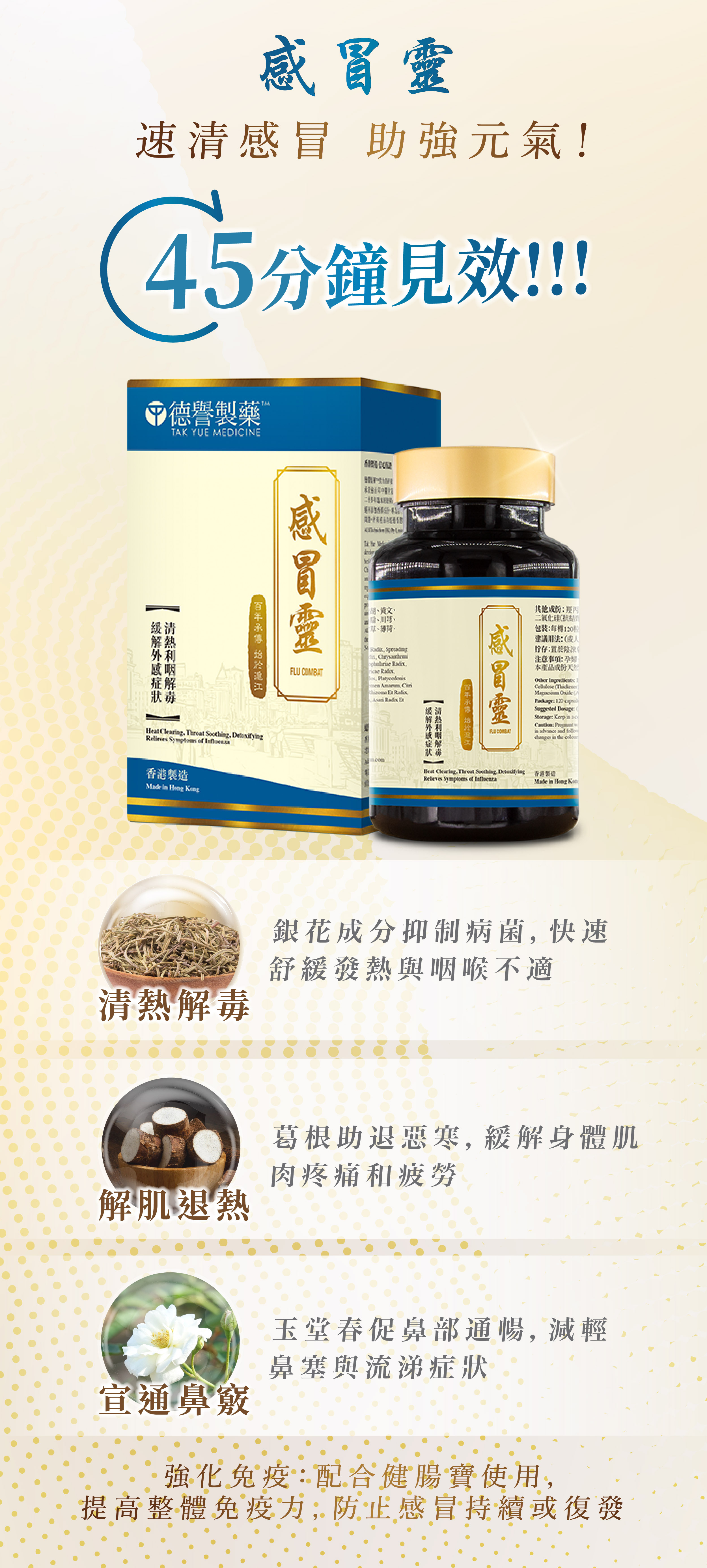 - 有效緩解各種初起感冒症狀,如頭痛發熱、惡寒身痛、鼻流清涕及咽乾喉痛等